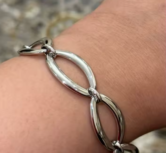 Designed to mirror the structure of the necklace, the Orbit Link Bracelet features the same elongated oval links in a refined, wearable scale. The open-link construction allows for natural movement while maintaining a clean, confident presence on the wrist.