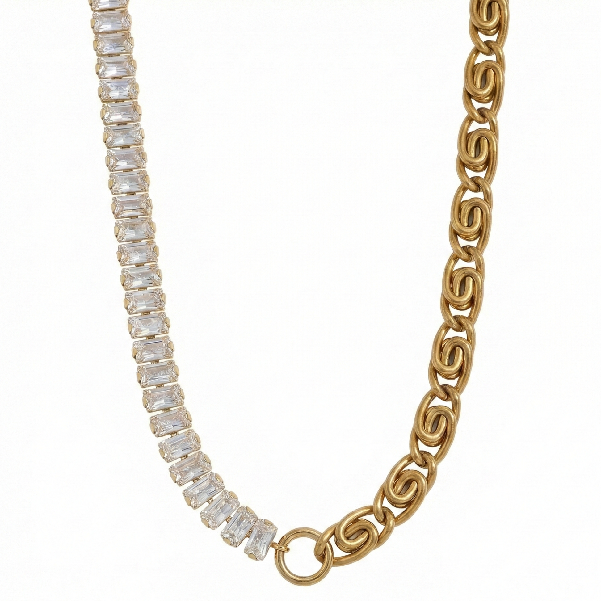 Designed to balance structure with refinement, the Vector Chain Necklace combines polished gold links with a seamless row of cubic zirconia for a clean, modern contrast. The design sits naturally along the collarbone, offering presence without excess.